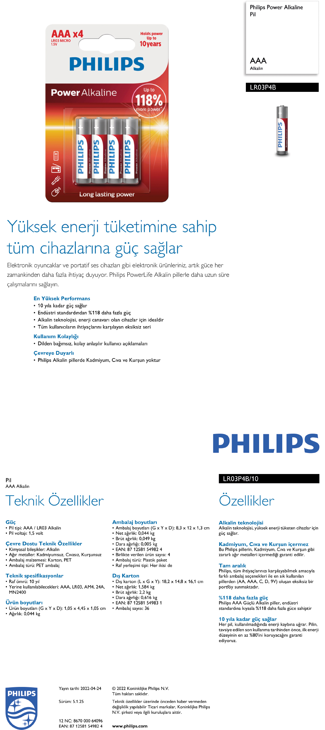 En Uygun Philips LR03P4B/10 Power Alkaline Pil AAA | GüvenToner